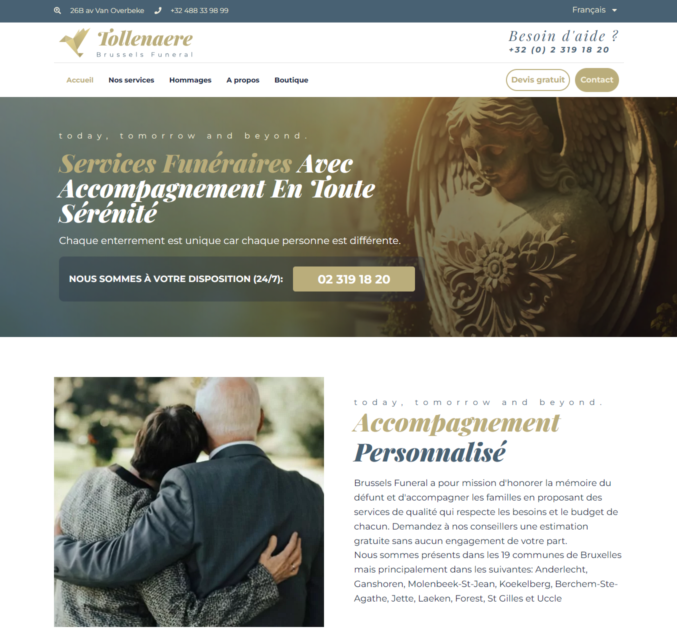 En résumé, la nouvelle plateforme web de Brussels Funeral constitue un outil stratégique, renforçant leur mission d’accompagnement personnalisé tout en optimisant leur visibilité locale. L’objectif était de créer un espace numérique aligné avec leurs valeurs, facilitant l’accès aux services et apportant une réponse efficace aux besoins de leurs clients dans un moment crucial.